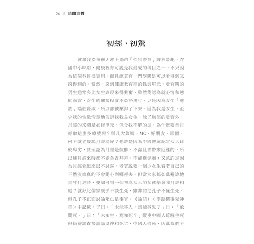 就讓我從每個人都上過的「性別教育」課程說起,在國中小時期,健康教育可說是我最愛的科目之一,不只因為這個科目很實用,而且總算有一門學問是可以看得到又摸得到的。當然,說到健康教育裡的性別單元,發育期的男生通常多比女生表現來得興奮,雖然我認為就心情和態度而言,女生的興奮程度不亞於男生,只是因為女生「應該」端莊賢淑,所以都被壓抑了下來。因為我是女生,至少我的性徵清楚地告訴我我是女生,除了胸部的發育外,月經的來潮是必修單元,但令我不解的是,為什麼要替月經取這麼多綽號呢?舉凡大姨媽、MC、好朋友、那個,何不就直接說月經就好?也許是因為中國傳統認定女人比較卑劣,甚至認為月經是骯髒、不潔且會帶來厄運的,所以連月經來時都不能拿香拜拜,不能進寺廟;又或許是因為月經看起來很不討喜,老實說要一個小女生看著自己的下體流血真的不會開心到哪裡去。但當大家都如此避諱地直呼月經時,要如何叫一個初為女人的女孩學會和月經相處?就好比儒家幾乎不談生死,雖非認定孔子不懂生死,但孔子不正面討論死亡是事實。《論語》<季路問事鬼神章>中記載,子曰:「未能事人,焉能事鬼?」曰:「敢問死。」曰:「未知生,焉知死?」縱使中國人瞭解生死但仍避諱直接談論鬼神和死亡,中國人怕死,因此我們不去談論死亡,但死亡是人生必經的終點,熟悉死亡的存在,不就更能坦蕩地接受嗎?