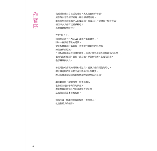 本書根據2007年8月開始連載於周刊《AREA》的話題專欄「電影食堂」重新編輯。