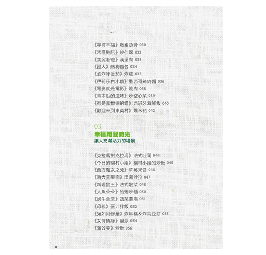 令人垂涎三尺的菜餚,是電影中的最佳配角,也為故事增色不少。遇到以鄉下為故事背景的電影,可以營造特有的溫馨感;遇到驚悚電影,緊張懸疑氣氛下的餐點,看似美味的食材去卻是對主角心理寫照的反諷。有時要拍出準備開動的感覺,有時要拍出吃得很凌亂的樣子。透過電影的故事與對白,這些看似美味的料理,吃起來更是叫人感動!