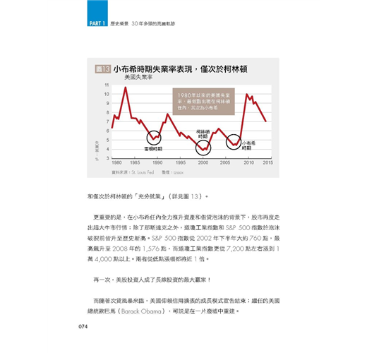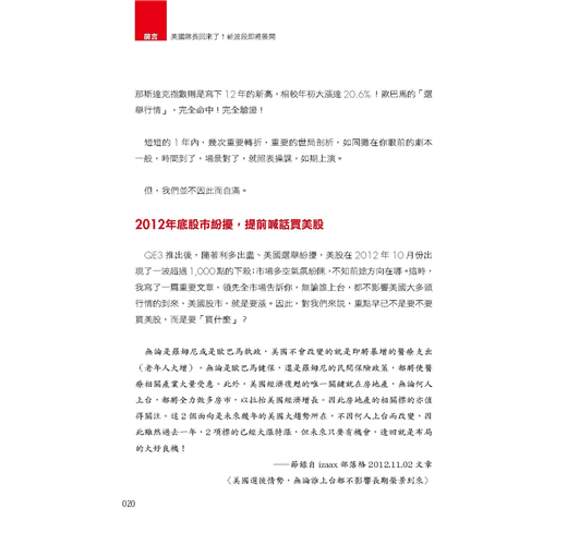 美國總統選舉前後,道瓊工業指數可望來到歷史高點附近位置,屆時美國經濟應該已經穩定維持在2.5%~3.5%的位置,而失業率則穩定回落到7.2%~7.8%的位置。」──節錄自《經濟指標告訴你&沒告訴你的事》第232頁