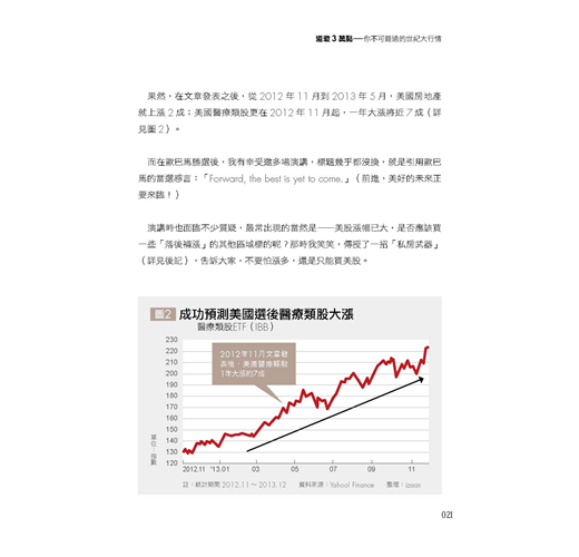 果然,在文章發表之後,從2012年11月到2013年5月,美國房地產就上漲2成;美國醫療類股更在2012年11月起,一年大漲將近7成。而在歐巴馬勝選後,我有幸受邀多場演講,標題幾乎都沒換,就是引用歐巴馬的當選感言:「Forward, the best is yet to come.」(前進,美好的未來正要來臨!)