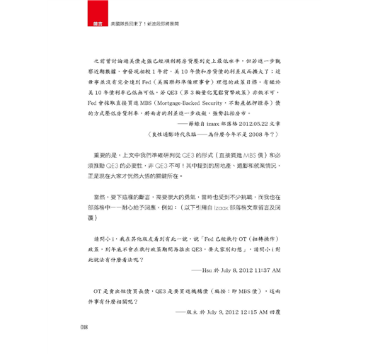 「請問小i,我在其他版友看到有此一說,說「Fed 已經執行OT(扭轉操作)政策,到年底不會在執行政策期間再推出QE3,要大家別幻想」,請問小i對此說法有什麼看法呢?」──Hsu 於 July 8, 2012 11:37 AM