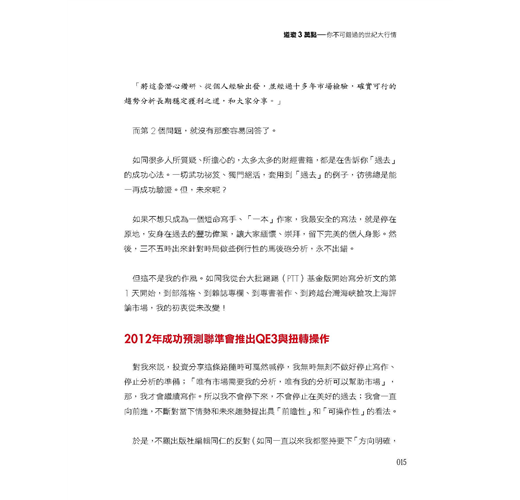 對我來說,投資分享這條路隨時可戛然喊停,我無時無刻不做好停止寫作、停止分析的準備;「唯有市場需要我的分析,唯有我的分析可以幫助市場」,那,我才會繼續寫作。所以我不會停下來,不會停止在美好的過去;我會一直向前進,不斷對當下情勢和未來趨勢提出具「前瞻性」和「可操作性」的看法。於是,不顧出版社編輯同仁的反對(如同一直以來我都堅持要下「方向明確,不模稜兩可」的標題),我在2012年4月出版的書籍,對於未來一年的經濟和投資市場情勢,斗膽做出了前瞻分析。