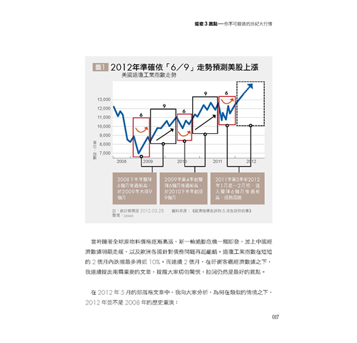 「從2008年後,美股的走勢還有著另一個巧妙的巧合,美股從歐巴馬上任後維持「6╱9」走勢──回檔整理6個月並收復前高,大漲9個月,再進入6個月的回檔整理並收復前高,再漲9個月;2011年8月開始的回檔已是第3次回檔,而後於2012年2月再度收復前高,目前(2012年3月)持續攻堅中。