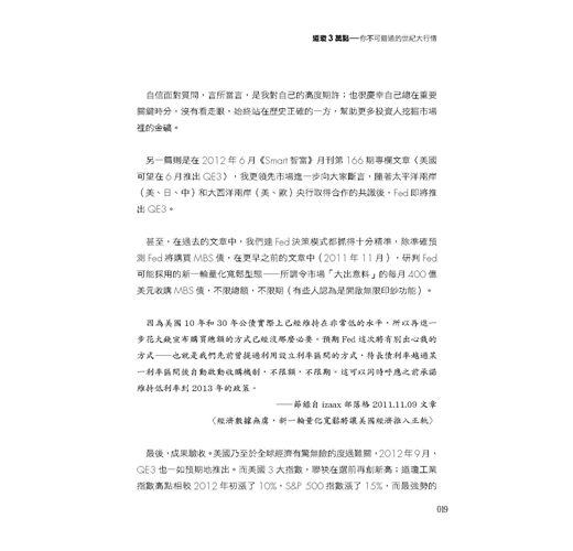 另一篇則是在2012年6月《Smart 智富》月刊第166期專欄文章〈美國可望在6月推出QE3〉,我更領先市場進一步向大家斷言,隨著太平洋兩岸(美、日、中)和大西洋兩岸(美、歐)央行取得合作的共識後,Fed 即將推出QE3。