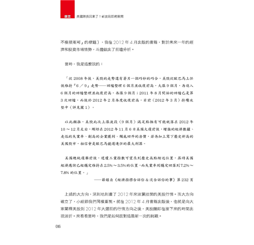 美國總統選舉前後,道瓊工業指數可望來到歷史高點附近位置,屆時美國經濟應該已經穩定維持在2.5%~3.5%位置,而失業率則穩定回落到7.2%~7.8%的位置。」(節錄自《經濟指標告訴您&沒告訴您的事》第232頁)