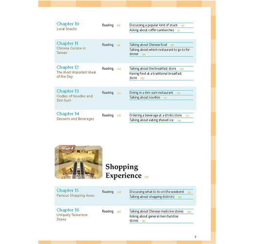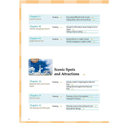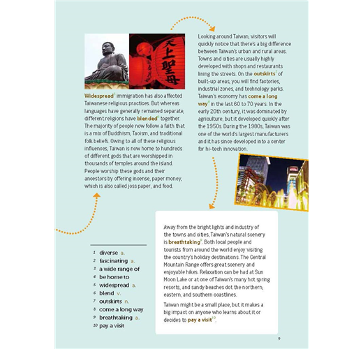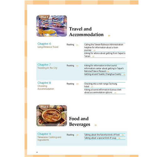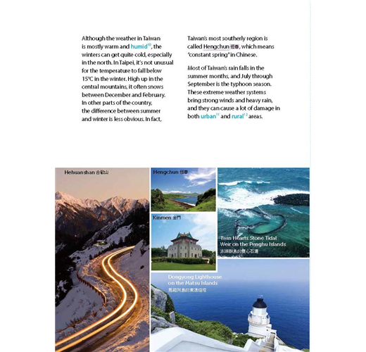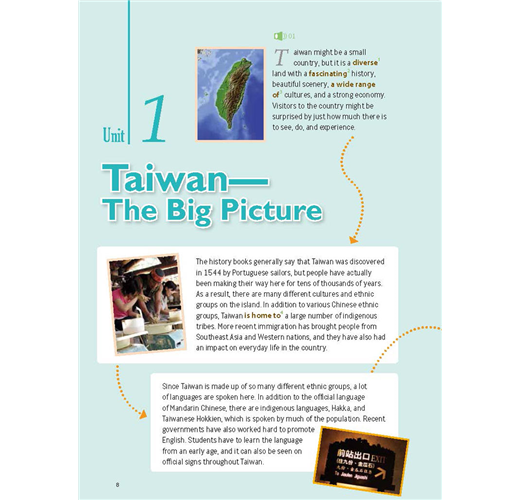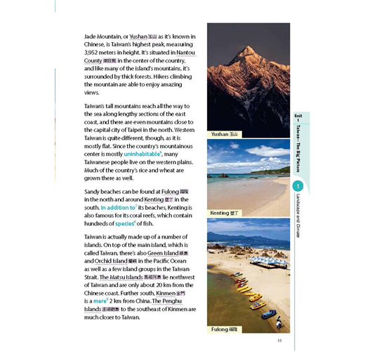 Each chapter contains a reading passage on the main topic. Detailed information about Taiwan’s culture, history, religion, language, food, or attractions is provided in the passages.