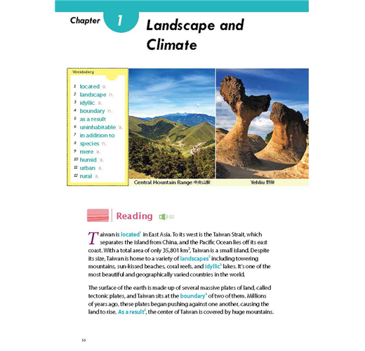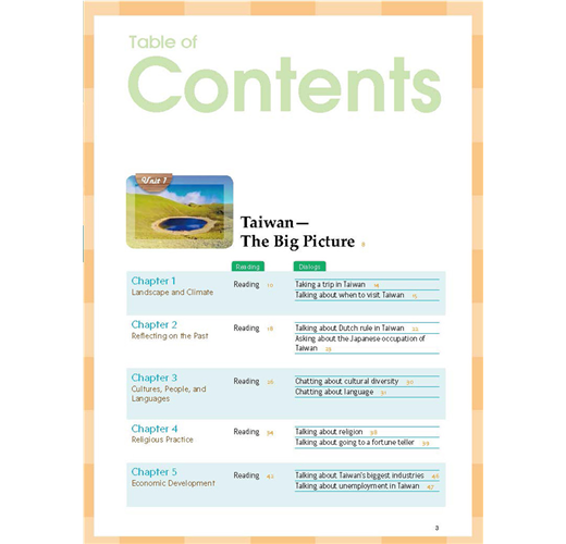 每一章包含一篇閱讀文章,文章扣緊主題,詳述台灣之文化、飲食、交通、景點等。此部分是本書學習的重點,在瞭解如何使用英文描述台灣之後,再輔以後面單元的會話練習,方能致用。