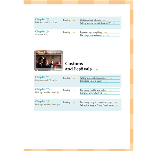 There are 27 chapters, which have been split into six major topics: Introduction, Travel and Accommodation, Food and Beverages, Shopping Experience, Scenic Spots and Attractions, and Customs and Festivals.