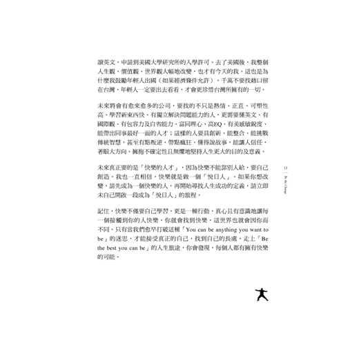 這是朱平對年輕人的鼓勵,他相信,每個人的改變都是一個發散的漣漪,能將影響力一圈一圈的擴散出去,透過閱讀這本書,得到啟發(Be Inspired),學習參與(Get Involved),進一步行動(Take Action),完成了這改變的歷程。