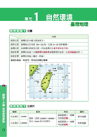 地理:運用大量的圖表分析,將文字敘述轉化為圖像記憶,分門別類地將臺灣地理、中國地理、世界地理的觀念統整。同學熟悉觀念後就能夠輕鬆應付各種題型。