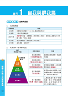 歷史:將臺灣歷史、中國歷史、世界歷史以圖、表分開整理、清楚比較,讓同學可以按照時間順序記住歷史上發生的重要大事,並能夠分析歷史的成因與結果。