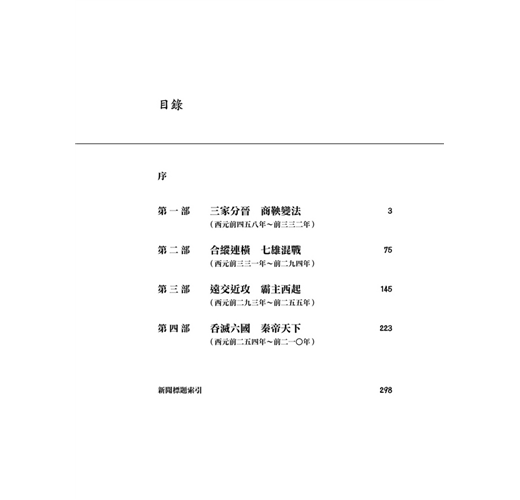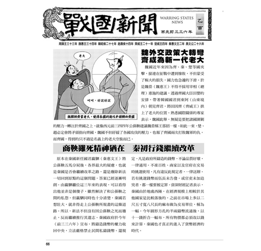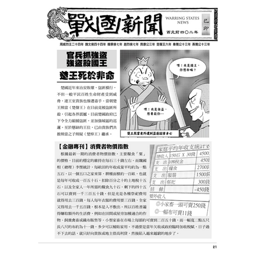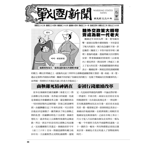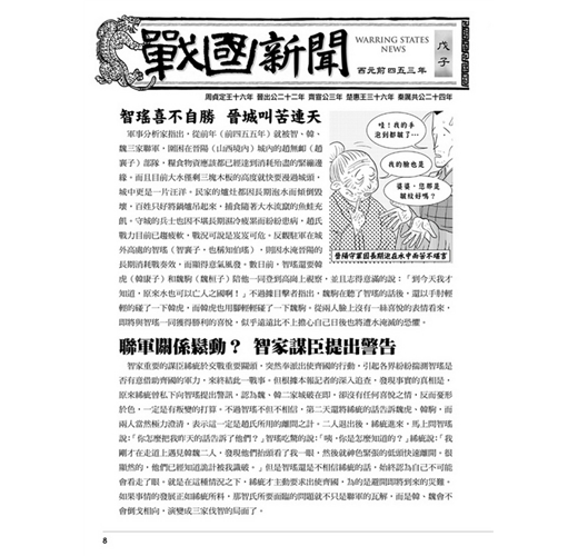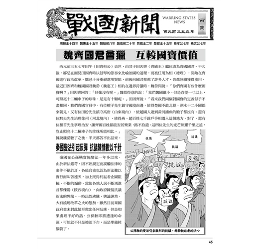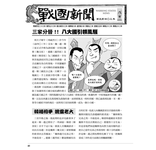 《戰國新聞》是「圖像編年史」系列中,繼《三國時報》之後的第二本創作。本書內文共約十七萬字,搭配三百多張左右依新聞需求所畫的插圖。內容自西元前四五八年三家分晉開始,貫穿整個戰國時代到西元前二一○年秦始皇帝嬴政駕崩為止,詳實的記錄這二百多年間五百多則的重要新聞,並依次分為「三家分晉 商鞅變法」、「合縱連橫 七雄混戰」、「遠交近攻 霸主西起」、「吞滅六國 秦帝天下」等四部。同時也在相關新聞出現的版面,收錄了如「造箭技術」、「墨家防禦術」、「消費者物價指數」、「秦國的二十級爵位」、「虎符」、「和氏璧」、「火牛陣」、「勒名工官」、「秦始皇陵」……等三十篇的特別報導,讓讀者能對報導的內容有更深入的了解。書中出現的職官名稱及地名,也都標註了等同現代常見的稱呼,以幫助讀者更容易的了解其意義。為了方便查考及索引,在本書的最後也依年代製作了「新聞標題索引」,可以快速的瀏覽戰國時代的重大事件發展,並輕鬆的找到想要搜尋的歷史事件。