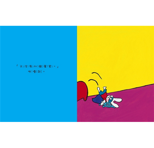 繼續讀下去,可以觀察到每一頁的用色大膽鮮明,使用強烈對比且飽和的原色,配上造型簡單、線條充滿童趣的角色,讓人很難不喜歡上這隻小兔子。