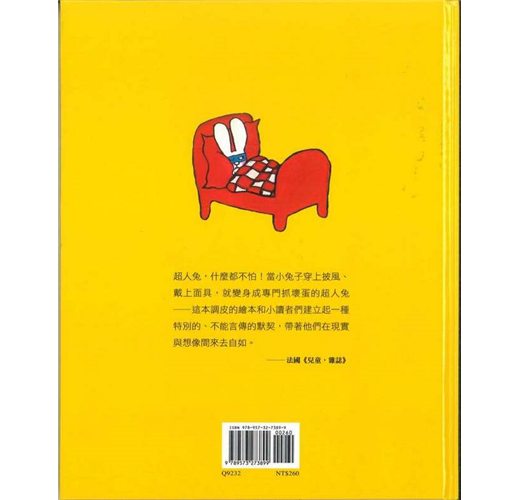 超人兔,什麼都不怕!當小兔子穿上披風、戴上面具,就變身成專門抓壞蛋的超人兔──這本調皮的繪本和小讀者們建立起一種特別的、不能言傳的默契,帶著他們在現實與想像間來去自如。──法國《兒童,雜誌》
