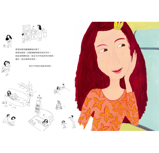 故事中母親利用書信表達她對女兒的愛意,透過文字描述彼此相處的快樂時光,點點滴滴回憶著孩子平日喜歡做的事情。這種用書信或卡片傳遞情意的方式,或許很多人認為要等孩子年紀大一點,總以為幼兒階段的孩童不會認字,這樣的方式並不適宜。然而,我卻認為小小孩一樣可以感受到書信或卡片的溫度。