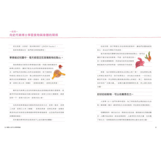 因為幼兒期的孩子特別容易與周遭環境產生共鳴,所以,如果孩子的飲食能夠和他們的生長環境有和諧的連結,這將對他們的成長有很大的幫助。以穀物(尤其稻米)與在地時令蔬菜為主的飲食,可以建立他們健康生活的基礎。而且,我建議穀物最好超過飲食總量的百分之六十。