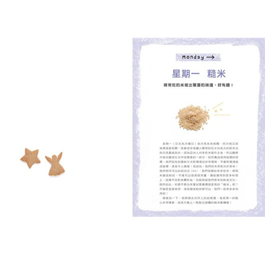星期一(日文為月曜日)與月亮息息相關,而月相又與海潮漲退有關,就會很容易讓人聯想到在水田長大的稻米也與月亮憂戚與共。因為亞洲人向來把米當作主食,所以觀察月相也變成生活中很重要的一部分,因而養成使用陰曆的習慣。我們祖先的農耕方式對環境也非常環保,不會對環境造成破壞,真是令人佩服!我認為,我們的未來取決於稻米!既然稻米可以自給自足(註),我們就應該多多吃米。將稻米磨成粉狀,不僅可以提高使用量,還能運用到更多料理上,這樣不但對身體有益,也能保留我們原...