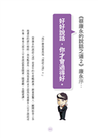 距離原本的《蔡康永的說話之道》出版,已經有一段時間了,這段時間,我又體會到了一些事,所以我決定寫下這幾年體會的《蔡康永的說話之道2》,另外也請到精彩的彎彎,為每篇都配上全新的插畫。我們想讓這個給你演練用的木人樁,再增加一些不同的零件、不同的角度,提供你在演練時,有更多的樂趣和收穫。
