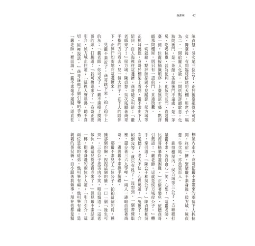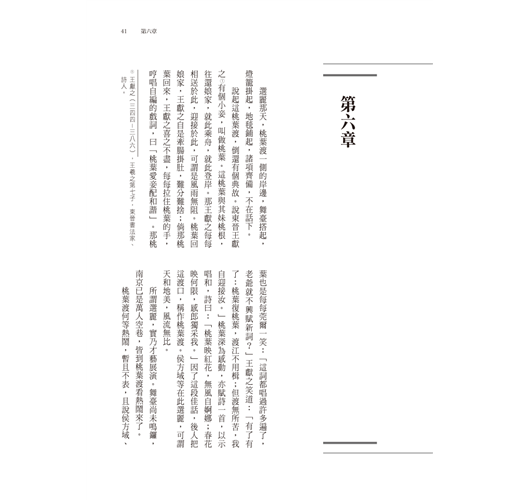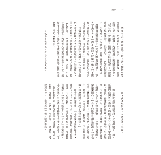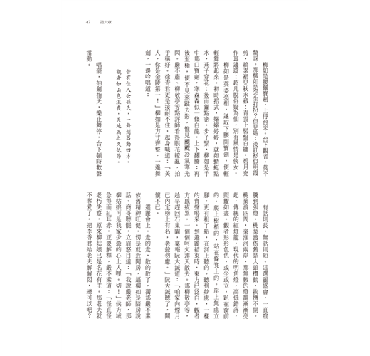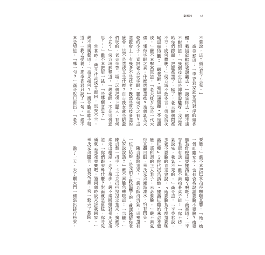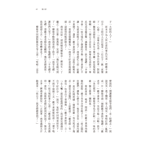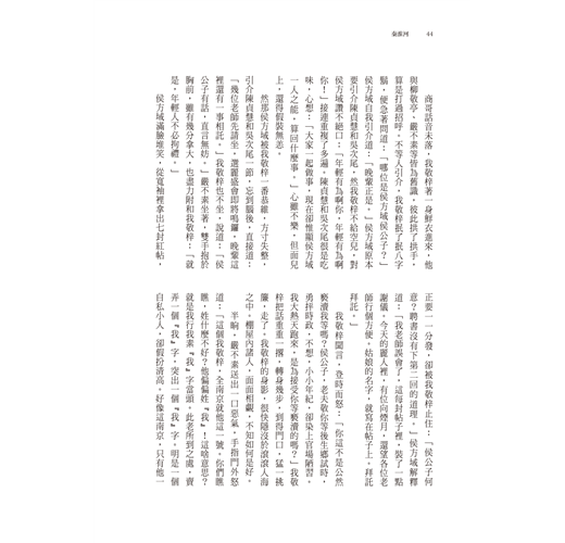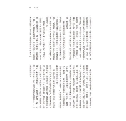 席間有兩個書僮,一個是冒辟疆的,喚作小六,生得肥膩難耐;一個是侯方域的,喚作商哥,長得骨瘦如柴。席外有條又笨又重的長凳,小六、商哥各坐一端。小六抱一大碗公飯菜,悶頭不語,惟狼吞虎嚥而後快。那商哥初來南京,眼窩又淺,拈來之景,便把眼裡裝得滿滿的。商哥貪景戀色,又十分性急,隨便吃了些東西,便趴到窗前,眼光不住的飄移,一會兒盯在秦淮河上,一會兒盯在對岸的鈔庫街上,總是一驚一乍的:「少爺,這南京可比咱歸德老家大多了!少爺,這南京可比咱歸德老家好玩多了。」幾位公子聽了商哥的話,怕掃侯方域的面兒,人人一幅充耳不聞的樣子。倒是侯方域,耳根熱得厲害,自言自語道:「鄉下小子,沒見過什麼大世面,見笑見笑。」說罷,也就過了。
