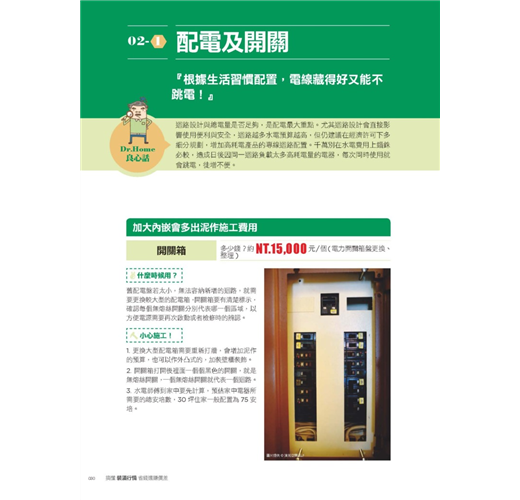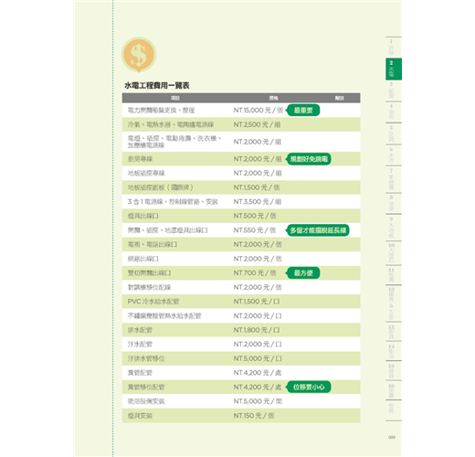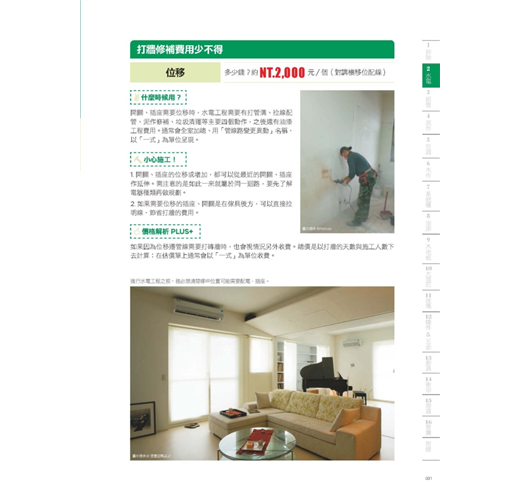 彙整拆除、水電、鋁窗、泥作、空調、木作、系統櫃、油漆等16個工程項目的費用總整理,方便讀者查閱每一個項目的價位是多少。