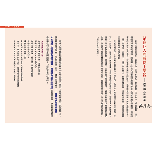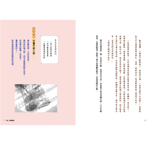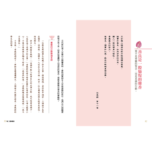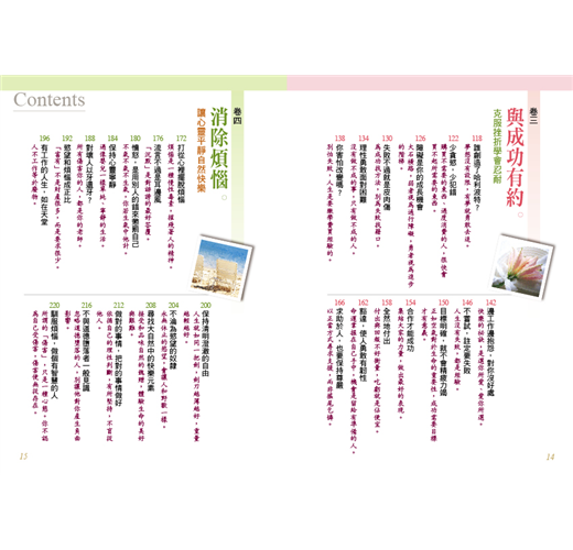 針對每篇主題,以簡短的名人名家格言警句,是幫助自我提醒的人生座右銘,只要遵從正道、堅持原則、勇敢逐夢,就能超越逆境,化危機為轉機,與成功有約。