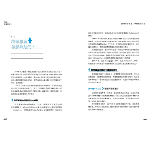 本書除了以圖文方式將這些成功募資的個案篇介紹外,還詳細介紹know-how工具指南,讓你的產品、計畫和理想被世界看見,夢想,不再遙不可及!