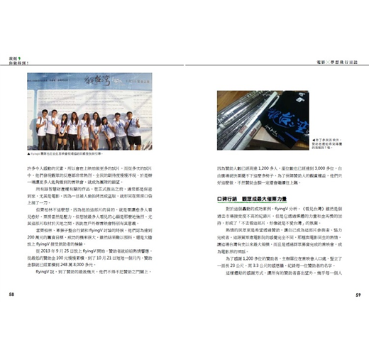 “在flyingV募資成功,已經讓早期關心這部片的人眼睛為之一亮,之後首映會的盛大舉行,引起媒體廣泛的報導,成為更強的造勢動能。這為文創提案者施打了一劑強心針,群眾募資除了提供一個極佳的募資管道,也可形成探測市場水溫的機制。 ”