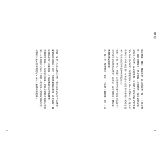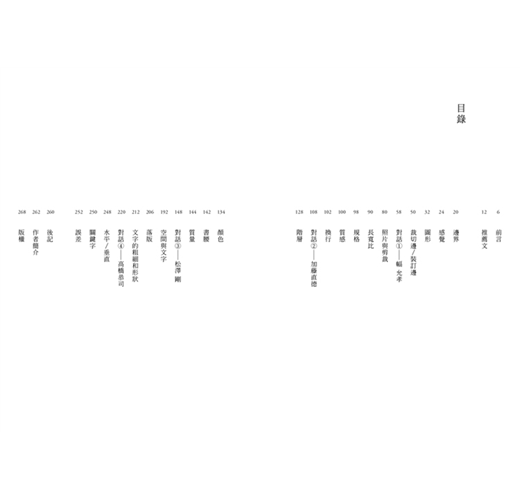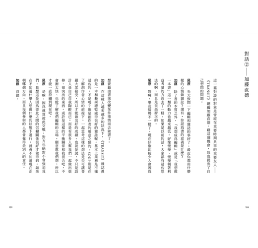 幅:你的設計裡,我最喜歡的就是只有文字的跨頁了。通常跨頁只有文字的話,感覺會很難,或是設計者會有種「這樣讀者可能會覺得太無趣了」的感覺而不敢這麼做,不過在SOUP(編註:SOUP DESIGN,尾原史和的設計事務所)的設計裡,空白似乎是一種「讓讀者閱讀」的空白。