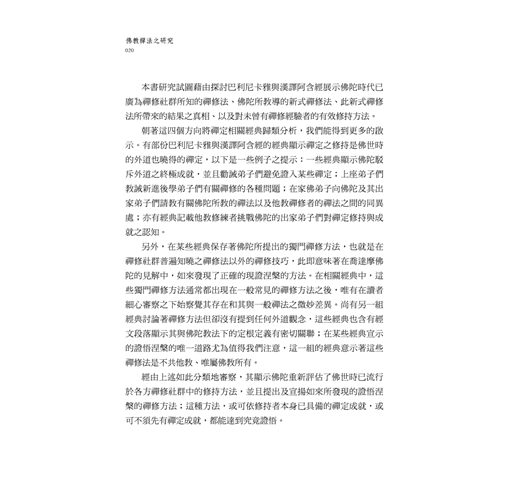 本書探討出四禪那是解脫道不可或缺之條件,如何在第四禪那中運作而得證現法涅槃,空、無相、無願三三昧是佛教獨門禪修法,有想而無所緣想之三摩地是佛教三摩地,以及經由四念處修得無相三昧和無尋三摩地,二者皆可是阿羅漢之三昧。