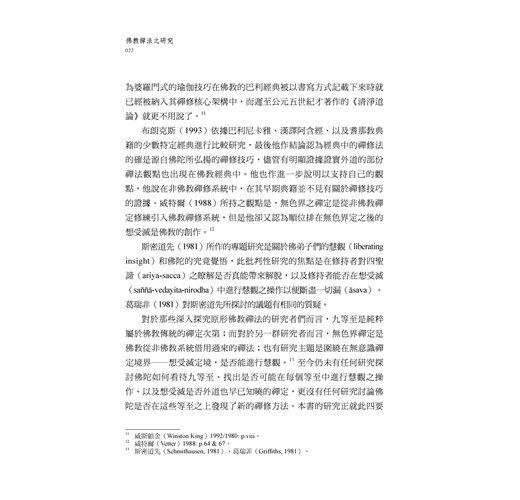 這兩組經典共有二十五部經,其顯示的意義是驚人的:佛陀說的現證涅槃或究竟解脫原來只涉及四禪那。此處呈現的意義立即令人想起那被視為與無餘涅槃有密切關聯的想受滅定豈不就成了大問題?本書不擬跳入這擁有千年歷史的佛教傳統之說卻又遭現代近半世紀的西方學術界犀利批判的深水熱火中去解答這個疑問。本書要先分析大量經典,再經由各相關方面進行考察以獲得更廣更深的瞭解。此見解除了在經典數量上得到肯定之外,更重要的是這些經典的說法者與說法對象或聞法者之多元更能去除或竄改或訛誤或偽經之疑慮。西方學術界對世尊之證道過程、方法、及結果都因為某些相關經典內容之不協