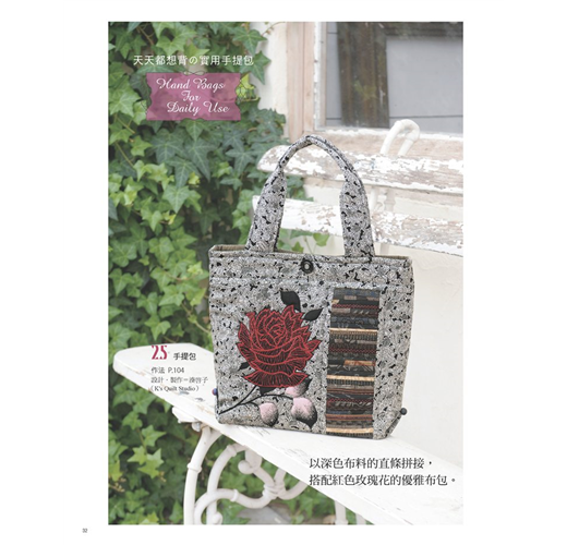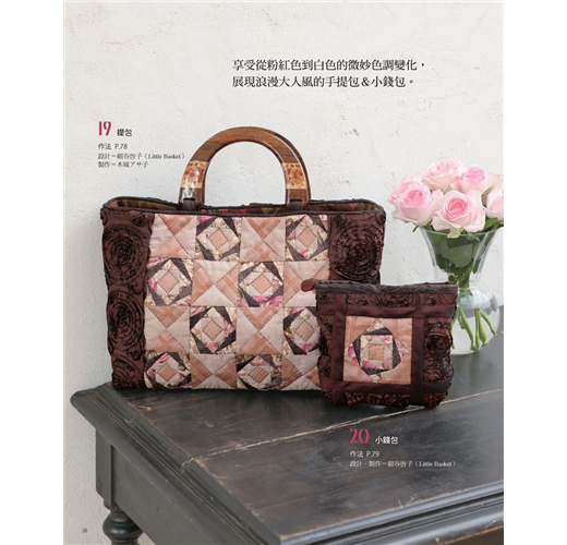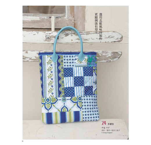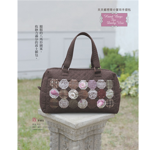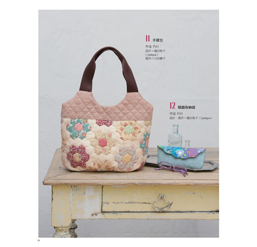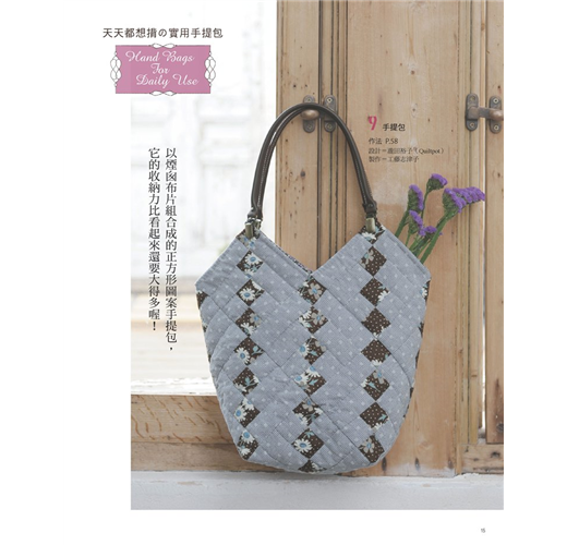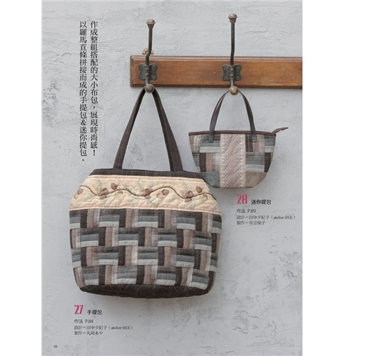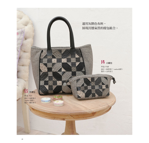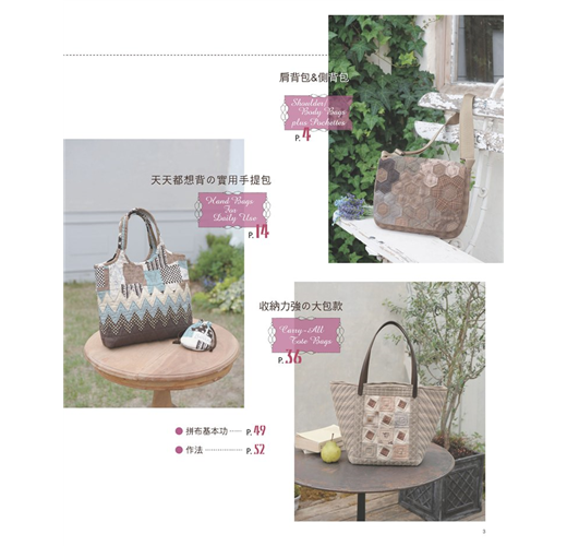 顛覆一般人對拼布的質樸印象,只要運用圖形的拼接變化,也能作出各式各樣時尚感超強的設計布包喲!不論是可隨身攜帶的實用肩背包、側背包、手提包、大托特包、口金包、小錢包、眼鏡袋、化妝包等,依照用途作好物品的收納及分類,就不怕東漏西漏,忘了帶重要的物品出門啦!