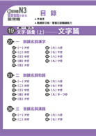 新日檢N3中,「文字」共有二大題,第一大題考漢字的發音;第二大題考漢字的寫法。因此本書第一單元,先將「文字」分為「訓讀名詞漢字」、「訓讀名詞和語」、「音讀名詞漢語」,並依五十音順序排列,一網打盡所有必考漢字,好學習、好記憶。