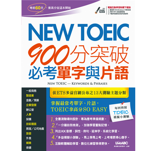 全書單字及片語依ETS(美國教育測驗服務社)所公布多益測驗考試內容之十三大主題分類,包括:一般商務、製造業、金融/預算、企業發展、辦公室、人事、採購、技術層面、房屋/公司地產、旅遊、外食、娛樂和保健。每類收錄該主題約100個最常出現的字彙。