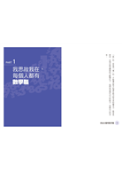 名人推薦: 《我也有聰明數學腦》是一本普羅大眾的讀物,當您讀完這一本書,肯定會讓您「哇」一聲,數學真的這麼有用。這本書將會讓您見識到活化數學腦的同時,在職場上或生活上需要的觀察力、洞察力、分析力、判斷力、想像力、創造力、邏輯思考等能力自然具備了!這並不意味著假若以前您是數學課堂中的逃兵或是客人,您就需要投降!別擔心,數學腦這本書提供了隨手可得的數學遊戲,讓您挑戰自己一下,重新建立您的這些能力。