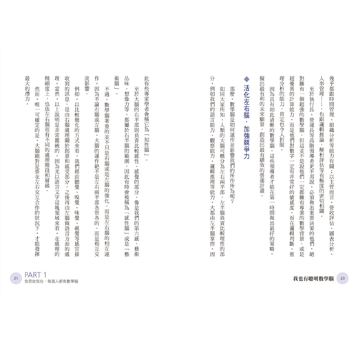 本書提供許多觀念與腦科學的研究不磨而合,讀者可以透過書中有趣的練習,來強化我們不靈活的數學腦,如此一來我們也可以輕鬆擁有「聰明數學腦」!