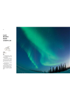 樹木纖細的輪廓直指天際,在樹木的上方,以星光閃耀的天空作為畫布,如夢似幻的極光正飄渺搖曳。