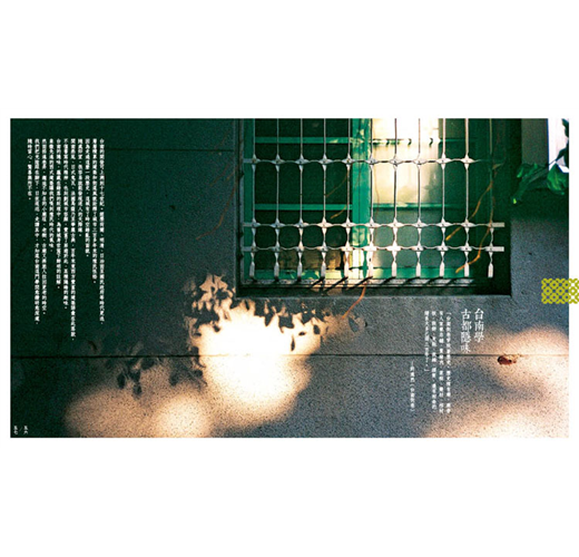 ◎ 跌入舊時光:時至今日,城市角落還留著往昔的日治遺風。想認識老台南,且將時光倒轉七十年,走入城市夾縫,尋訪時光座標,發現老台南人記憶中的日本鄉愁。