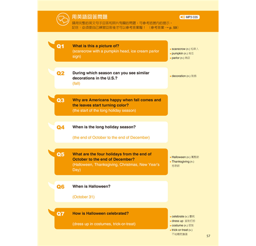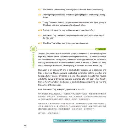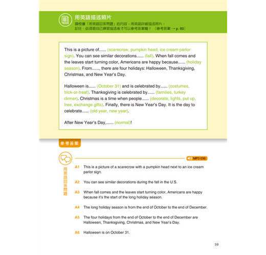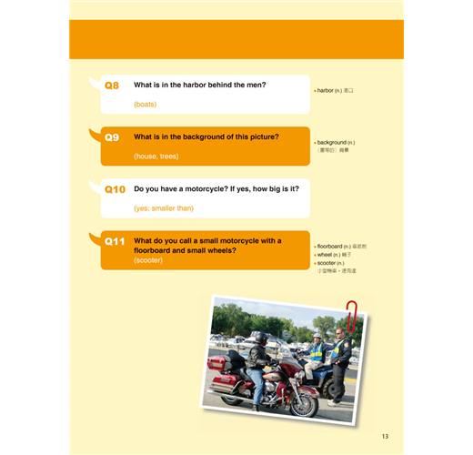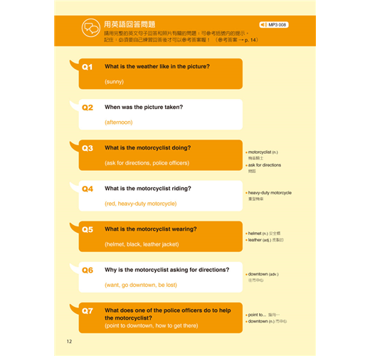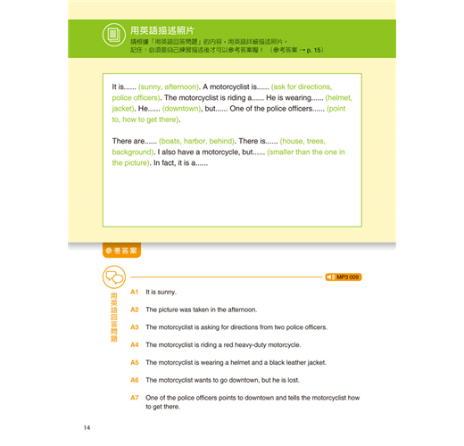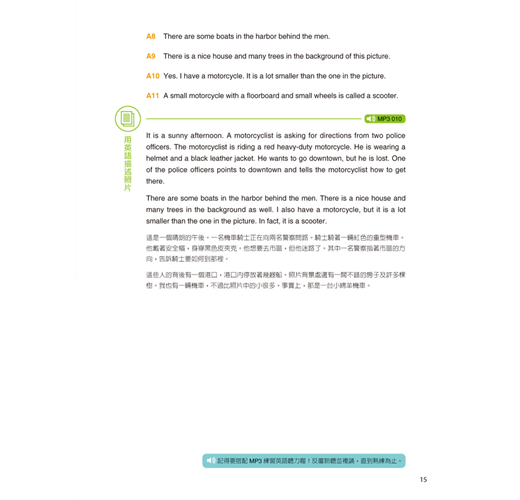 聽力好,口語能力自然更好!MP3收錄每個照片單元Step 2的問題和答案,以及Step 3的文章獨白。搭配MP3反覆聆聽並複誦,直到熟練為止。此外,為了模擬一問一答的情景,MP3中特別將Step 2所有的問題集中在一起,每個問題之間預留數秒,方便讀者回答。