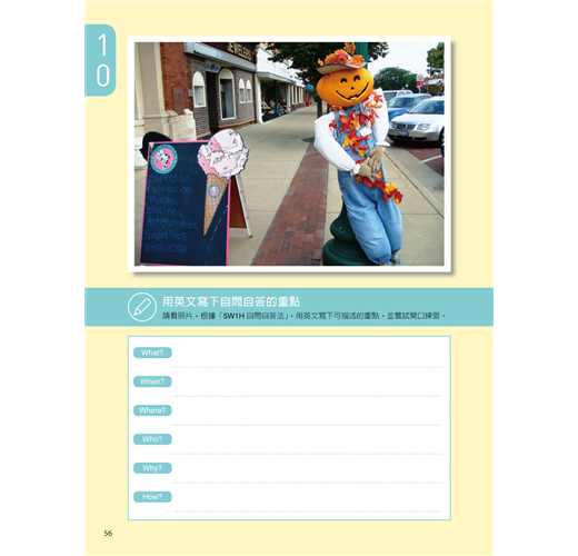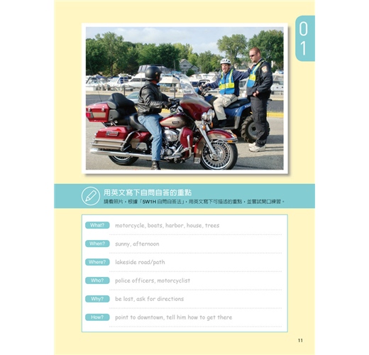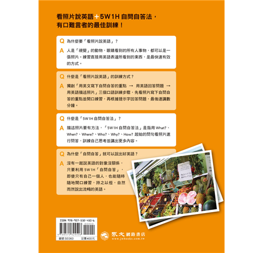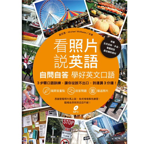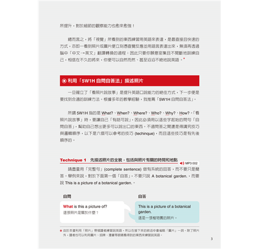 A:想講英語卻沒環境、沒對象,是台灣英語學習者的一大困擾,此時就得自己來創造英語環境。其中最簡單的方式就是「看照片說話」,這是因為人是視覺動物,將所看到的東西直覺說出來,是再自然不過的事。有鑒於此,本書設計「看照片說英語」的口語練習方式,帶領你先回答5W1H(即what, when, where, who, why, how)起始的問題,再連續描述照片數分鐘。一旦你習慣這種學習方式,就可以應用在生活中。這種方式非常簡單,卻可以讓自己隨時隨地都沉浸在英文環境中,自然而然提升口語能力。