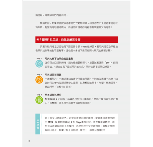 本書設計三個練習步驟:Step 1「用英文寫下自問自答的重點」→ Step 2「用英語回答問題」→ Step 3「用英語描述照片」。先看照片寫下自問自答的重點並開口練習說,再根據提示字回答問題,最後連續描述幾分鐘,循序漸進。