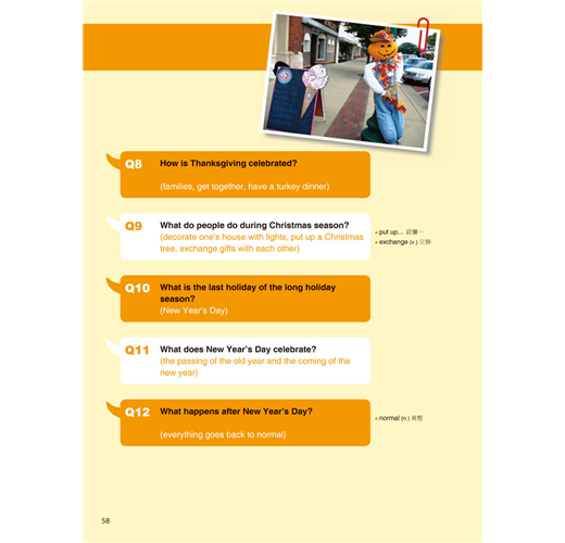 本書精選70張彩色照片,內容涵蓋食、衣、住、行、育、樂各方面,並由美籍大學教師編寫實用且道地的英語對話及獨白,幫助讀者藉由本書所提供的廣泛題材,「身入其境」、「即見即說」,學習真實世界的英語。此外,本書每個單元都提供相關單字、片語等,讀者在做練習時,不妨參考這些有用的資訊,反覆背誦,直到熟記、熟練為止。