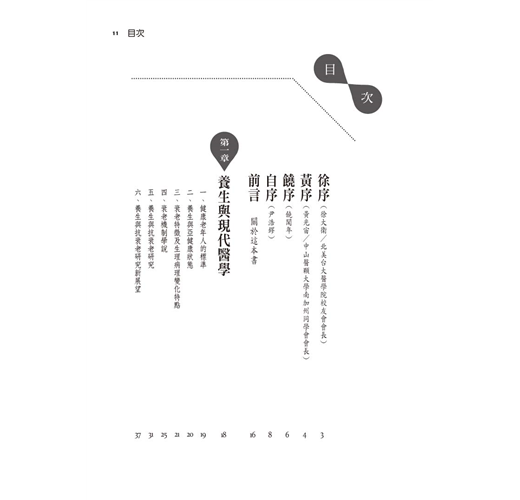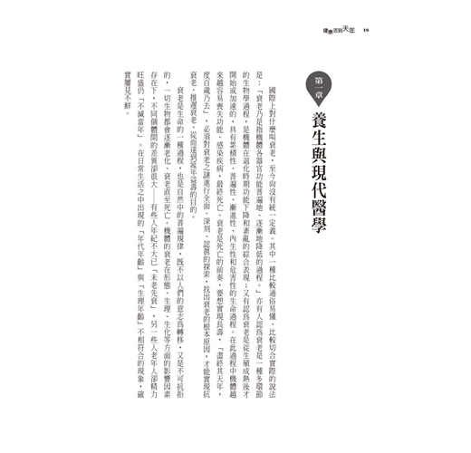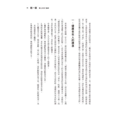結合中西醫:利用西醫科學方法對衰老相關疾病早期檢查、治療與預防,並利用人類生理、心理等衰老現象與中醫藥理、食理有效的醫學控制,爭取健康長壽。附有古代君王養生秘訣食譜:宮廷抗老長壽麵、餃子、包子、糯米飯等。