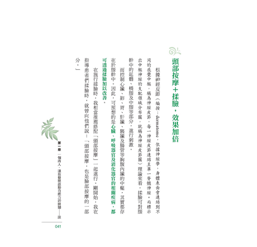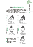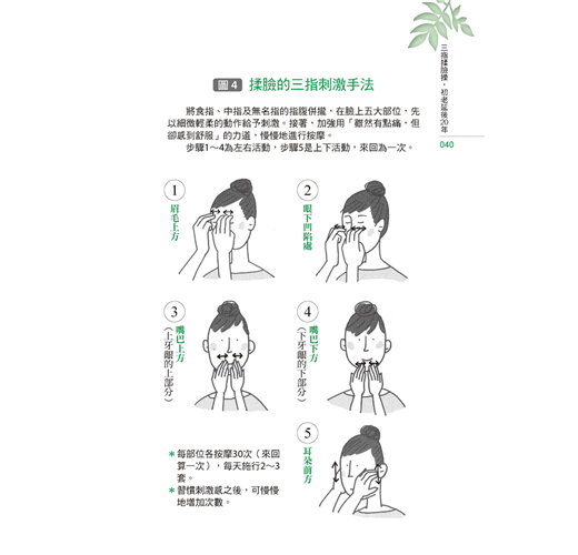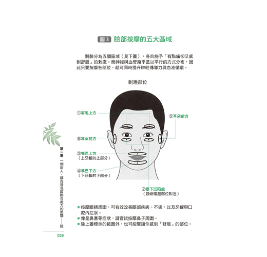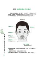 書中將揉臉圖解成五大範圍;而第四十頁中,將圖解說明揉臉的按摩手法。揉臉並不需要什麼太困難的技巧,唯一條件就是務必親自實踐。你會立刻感受到身心舒暢的體驗,這比任何理論都還重要。