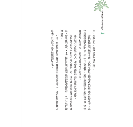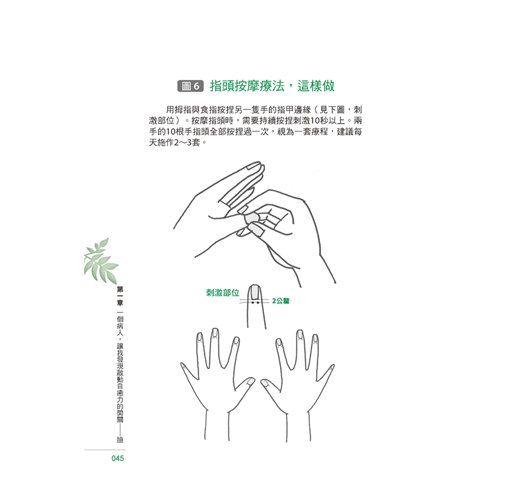 直到某一天,我在書店發現一本談「指頭按摩療法」的書,非常吸引我。翻閱後,竟然發現書中寫著「帕金森氏症獲得改善」的字眼。而指頭按摩療法,是一種只按摩手指、刺激指甲邊緣的自我療法(第二十九頁有詳細圖解說明)。
