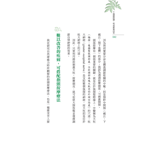 一切的契機來自於「指頭按摩療法」──自己按摩手指頭的健康法。這個方法,讓我發現自然療癒力(人體與生俱來對抗疾病的力量)的重要性,引領我進一步研究不依賴藥物的治療法,決定從腦神經外科轉往內科服務。