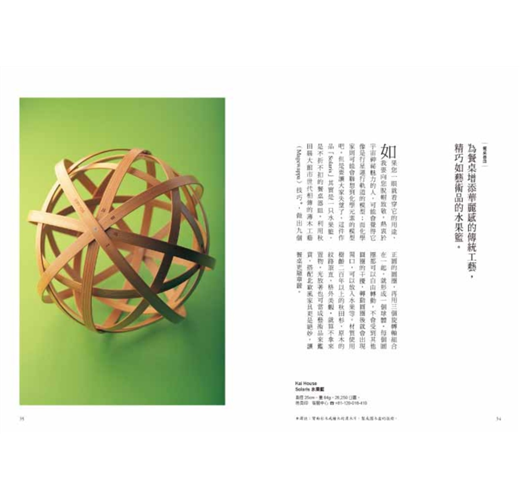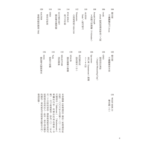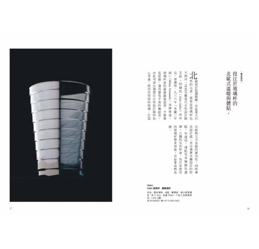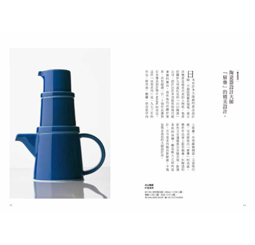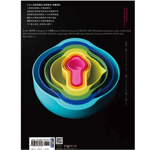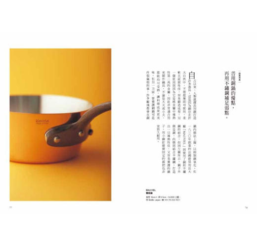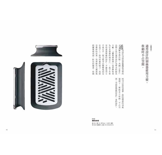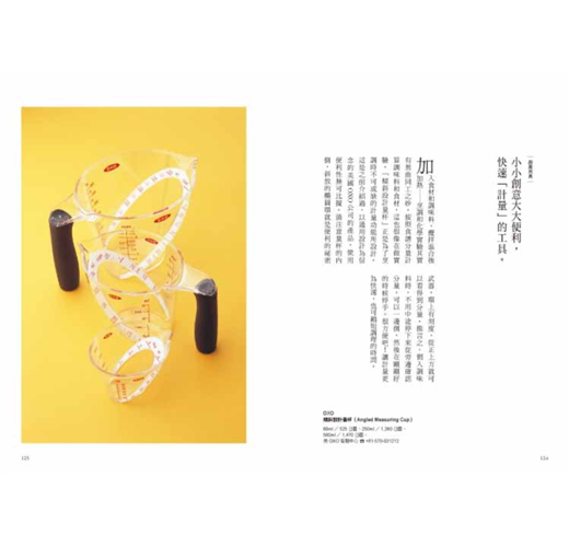 書中介紹了柳宗理、森正洋、馬克.紐森(Marc Newson)、艾諾.阿爾托(Aino Aalto)、史帝芬.貝斯(Steven Blaess)……等大師所打造的餐廚用品,不只具有藝術作品般的美麗外型,更具備生活上不可或缺的實用性與便利性。