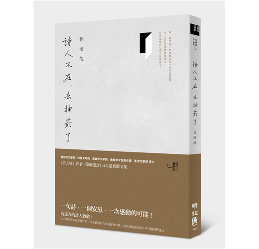 徐國能最新散文集《詩人不在,去抽菸了》共分三輯:「一片禱告一片恩寵」、「草莓時刻」、「花間一壺酒」,包括古典詩詞、現代詩名句、當代流行樂曲與名著電影賞析,在每篇作品中,作者徐國能引用詩文名句,解析原作詩文與現代生活的聯繫。