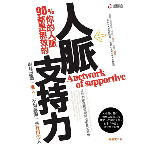本書就是一本想告訴你,其實,我們有九十%的人脈都是無效用的,而如何祛除九十%的無效用人脈,來打造自己的「人脈支持力」,讓自己可以成為即便在沒有任何抵押品的情況下,別人也願意將「五百萬元」借給自己的人,則是我們拓展和經營人脈必修的基本學分。