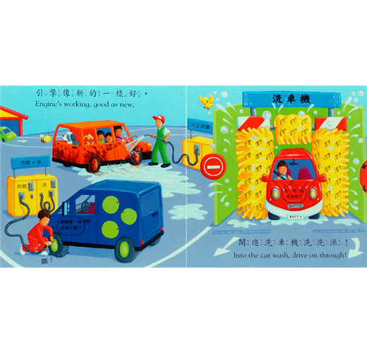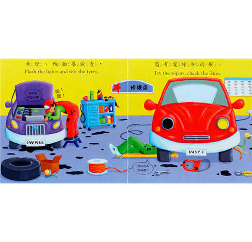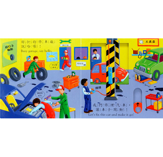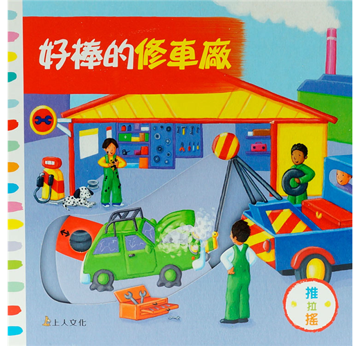 車燈不亮了,電線要檢查。雨刷要裝好,輪胎要充氣。可以推,可以拉,可以搖,可以轉,這本玩具書讓孩子在好棒的修車廠裡忙得好開心!
